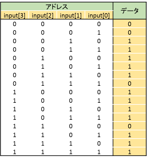 今回の場合,このSRAMのアドレス線にFPGA外からの入力信号を,SRAMのデータを先程の論理式(もどき)に対応した値にします.